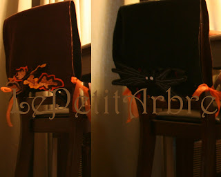 This is a reversible cover for the back of dinning room chairs. It is corduroy and felt. One side is for fall and thanksgiving and the other is a Halloween inspired by a Nightmare before Christmas.