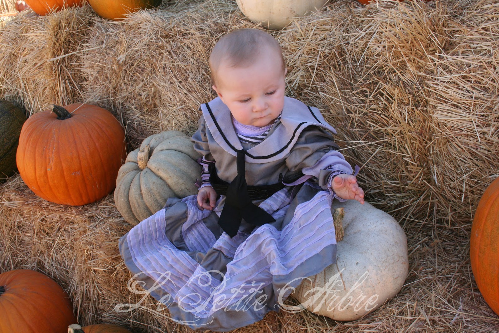 The tie is a knot of 1″ grosgrain black ribbon I hand stitched in place. If your pattern includes the ties (as mine did not) all the better for you.