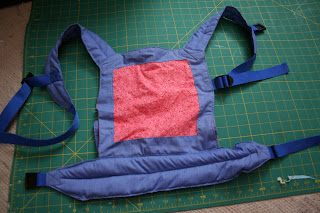 Sew the shoulder straps angled down to the top corners of the front panel. Sandwich the outside panel and the inside panel with the baby pocket, turn. To make sure I got them in right and straight, I opened the seam just below the top of the baby pocket, inserted the strap adjusters and top stitched with an X.