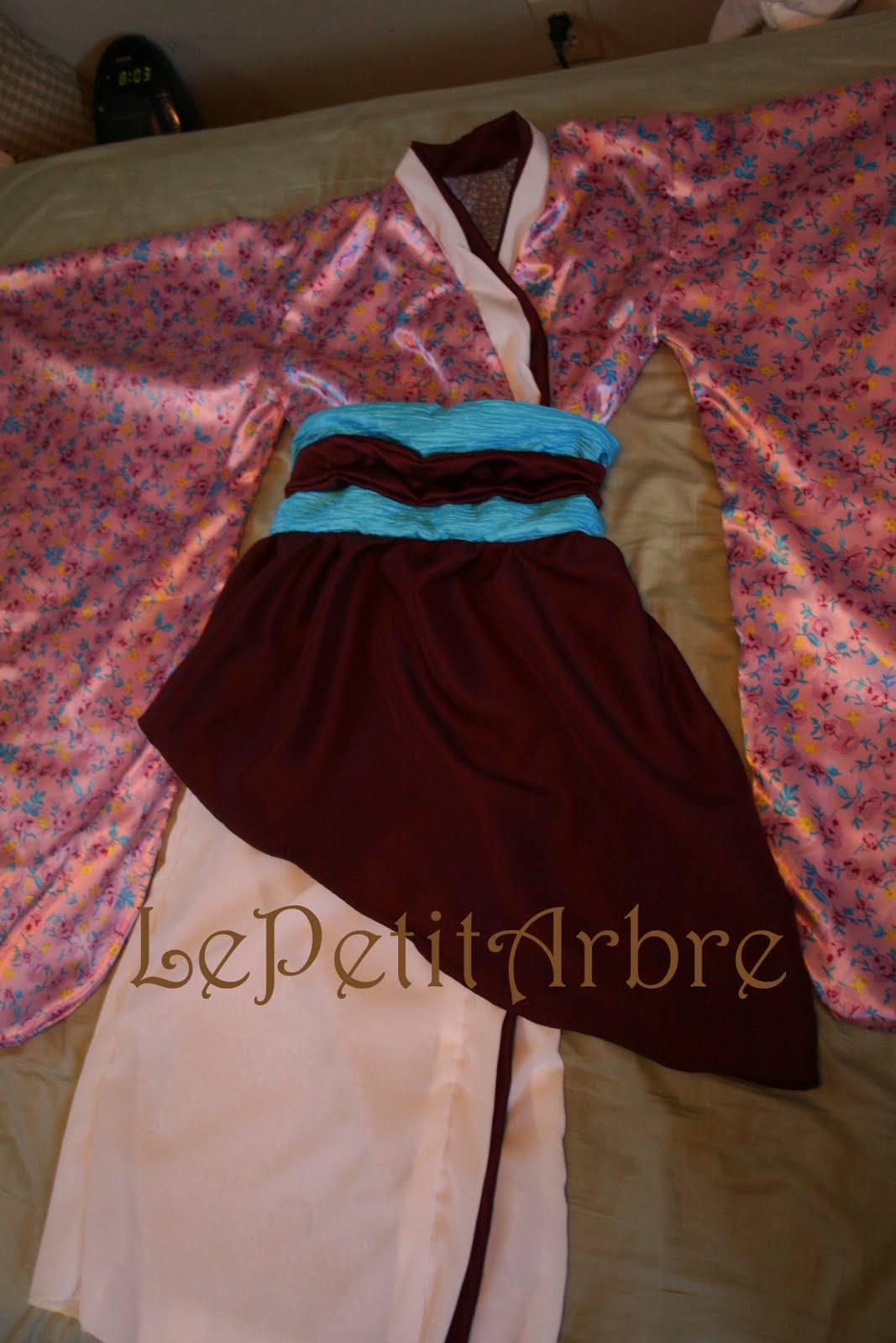 Just below the waist, about where the pattern says you can shorten it I cut it and added the change in skirting. I lined the sleeves with the same satin to make sure they had some weight but not too much. I wanted the kimono to be long, and drag on the floor a bit like the cartoon. I intended the red and white on the neck line to be in reverse like the movie, but I actually like this best, it shows up less at the bottom and in Japan the part at the neck would be red. Do what you like.