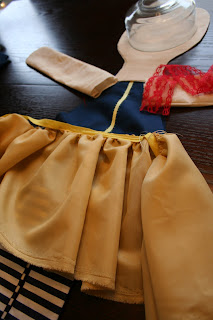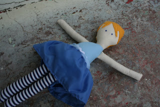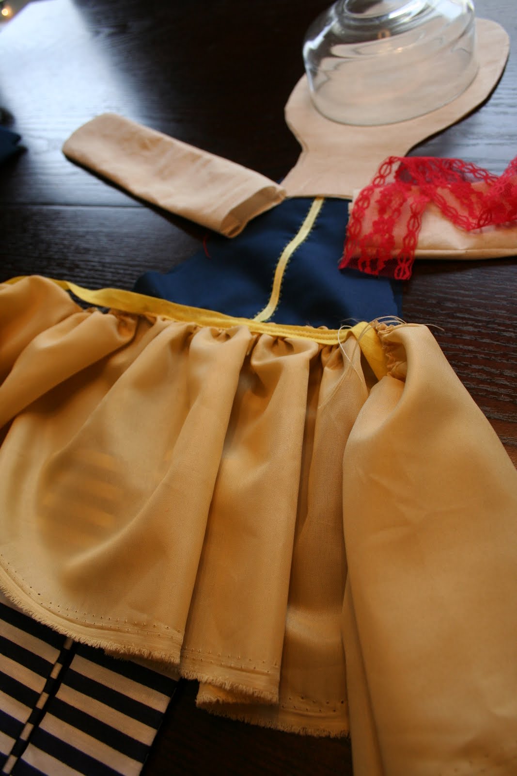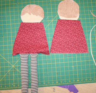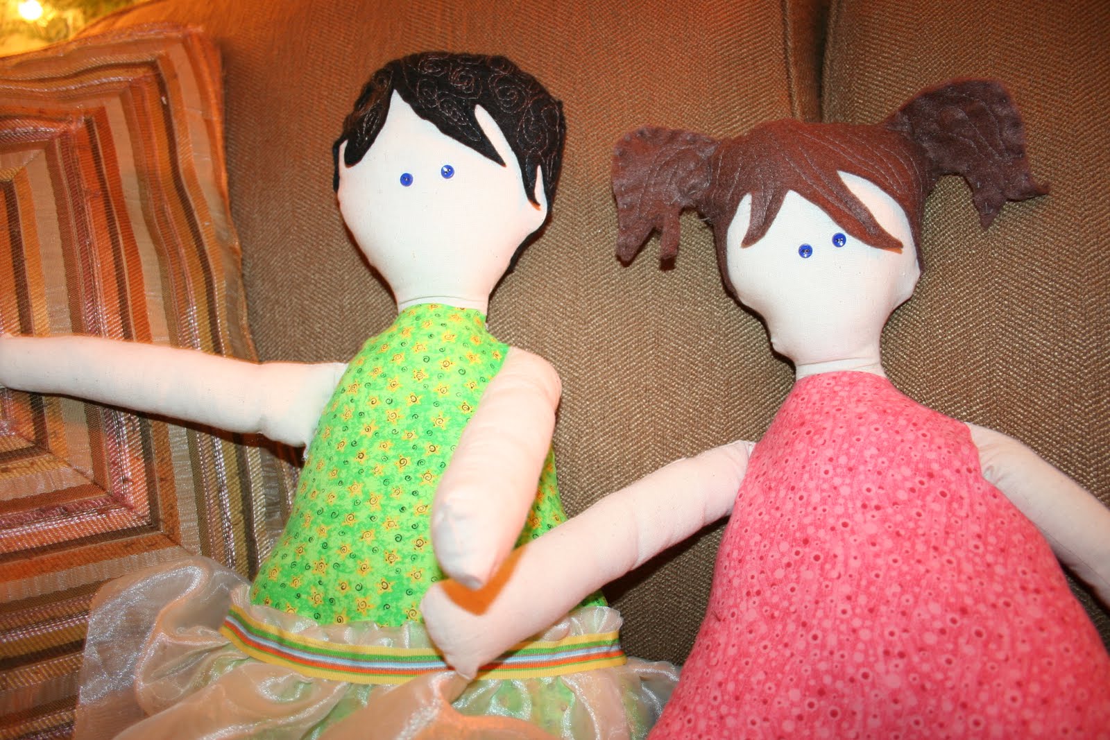 My favorite was the felt hair, the only place left for creativity. That and I started to add embellishments. Leftover dress lining for skirts, ribbon, rick rack, and tinny button eyes.