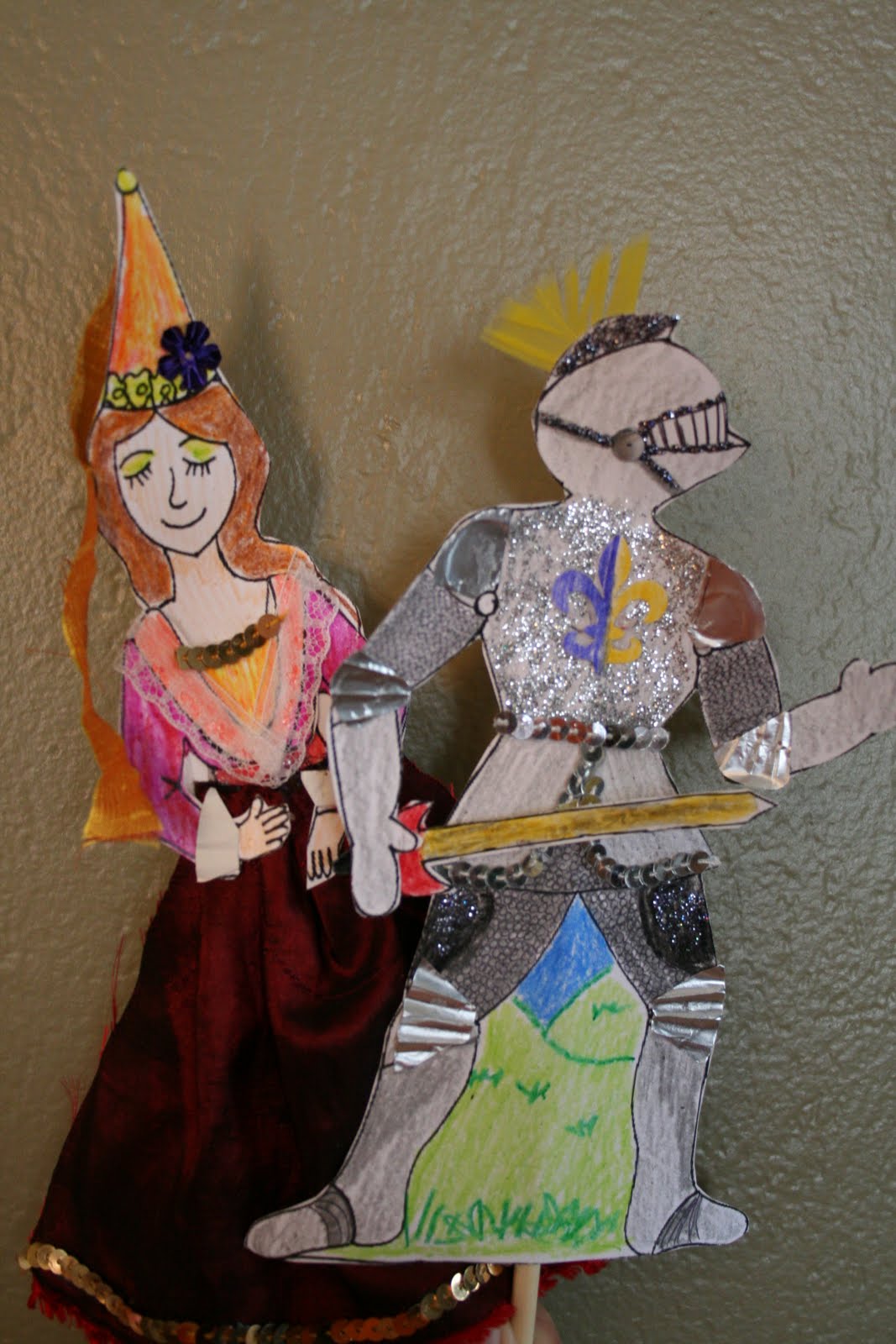 I made crowns from stiff felt (from the craft store: only one store of three had it), elastic, glitter, sequence and rick rack. I also made felt tunics with both our family crests on them.