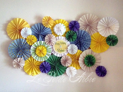 I spent an entire morning creating a wall hanging for the party. I glued it to a cardboard back. I poked holes in it before I began and strung it up with curling ribbon. I used all the construction paper I had in a drawer. I glued it all together with wood glue, don’t laugh, I don’t have a hot glue gun. I stapled the outside fans that extended beyond the cardboard. Turned out super fab I think!