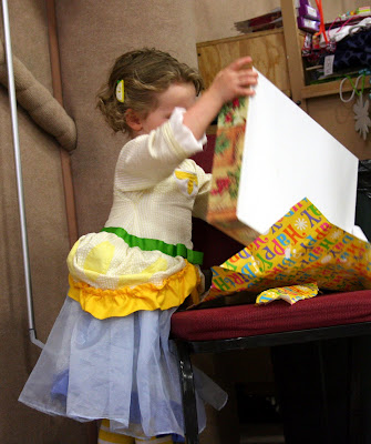 I then raided my mothers fabric closet and stole all the items to make a party dress for the honored guest. I kinda fabricated it out of my head from the cartoon and from other party dresses that inspired me. I bought yellow and white striped leggings to match the attire.
