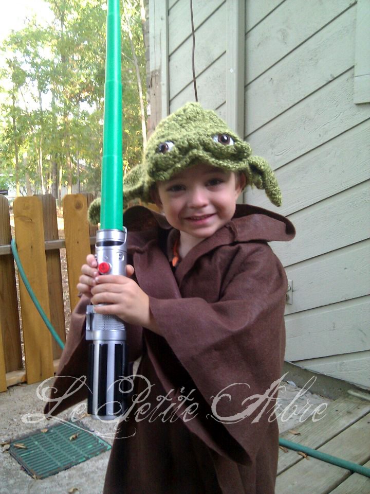 I thought it would be great to show you some simple costumes that doesn’t cost much. Last year, I made this crochet hat for my nephew. The coat is just felt and the Yoda hat is made of homespun yarn. I used this pattern for the hat and it turned out awesome. However, I forgot the cotton around the ears, oops! So, he is a young Yoda. I used plastic eyes instead of crochet ones. I am very pleased how it turned out.