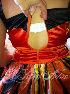 I made about 12 loops for each side and sewed them in at the alteration site. Then, I followed the “installing a zipper” instructions to close up the addition. Obviously, I didn’t use all the addition. Just enough to make the dress comfortable. Once complete, have the model wear the dress inside out and pin it closed. I left a little room so that when it gets laced up it can still pull in a bit to make it more form fitting. Then finish with Zipper manufacturing instructions.