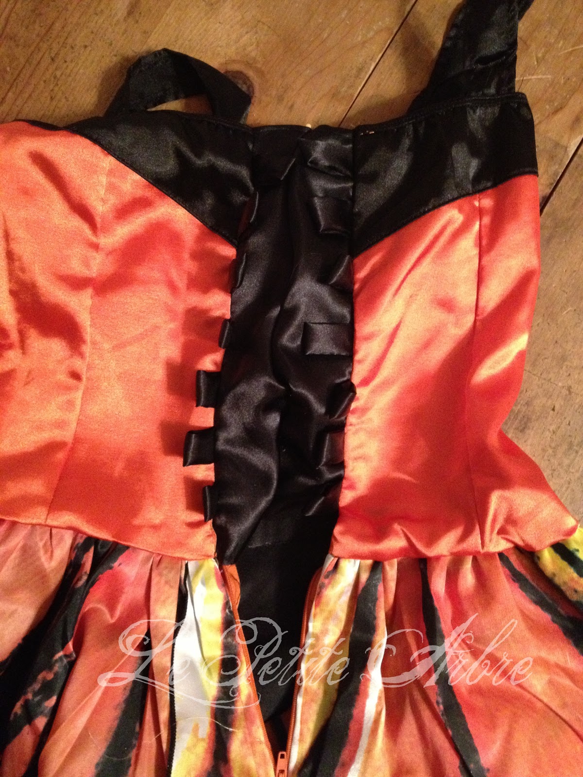 I used the pattern shape above from a formal dress pattern. I then cut two panels out of some black fabric. I went with black because I didn’t want to risk getting an orange fabric that did not match perfectly, thus looking obviously altered. I seam ripped the zipper out past the waist, but not completely out.