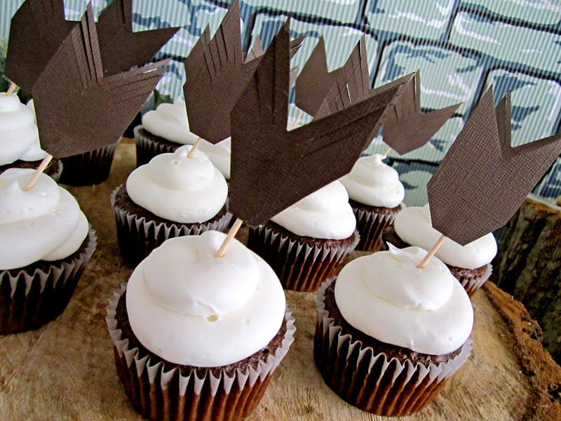 I love the arrow tails in the cupcakes. You could take this a step further by adding some red gel or sprinkles in the center of each cupcake to make it look like a target. The food display table looked amazing with the wood stumps and movie prop background. The bear claw cookies look so yummy and I love the bubbling cauldron idea to serve drinks from. She includes a full list and recipes at the bottom of the post with all the delicious food they made.